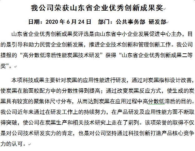 我(wo)公司榮獲山東省(shěng)企業優秀創新成(cheng)果獎